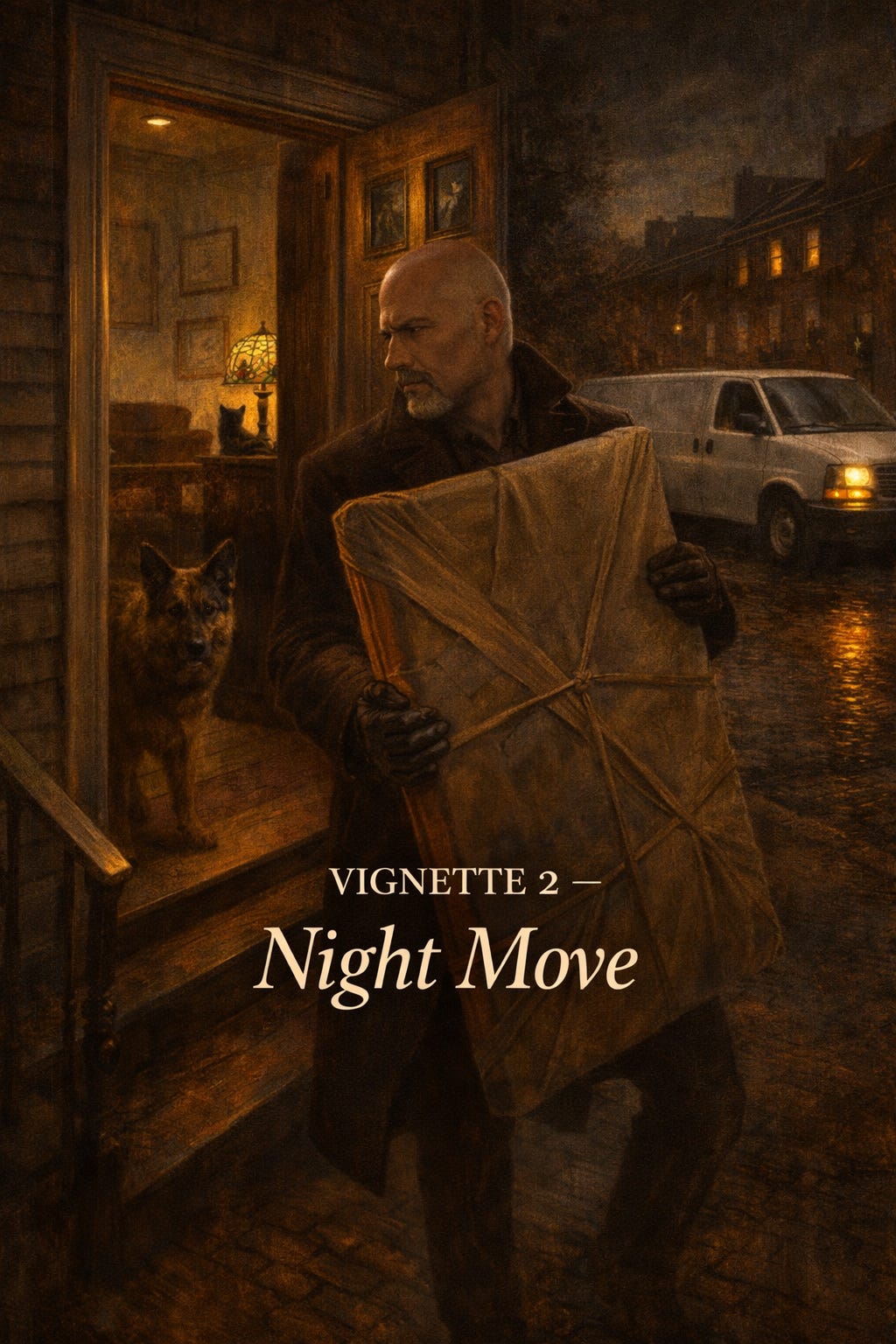 By the fourth run the cold outside had sharpened. Breath smoked briefly each time he stepped through the front door. The van’s cargo space had begun to smell faintly of wool, wood, and the restrained panic of valuable things handled in darkness. One frame was awkward enough that he had to take the front steps more slowly than he liked. On the sidewalk, he felt Jaxon watching from the window and almost laughed at the absurdity of finding comfort in being observed by his own dog while conducting what, to any honest language, was the burglary of his own life.